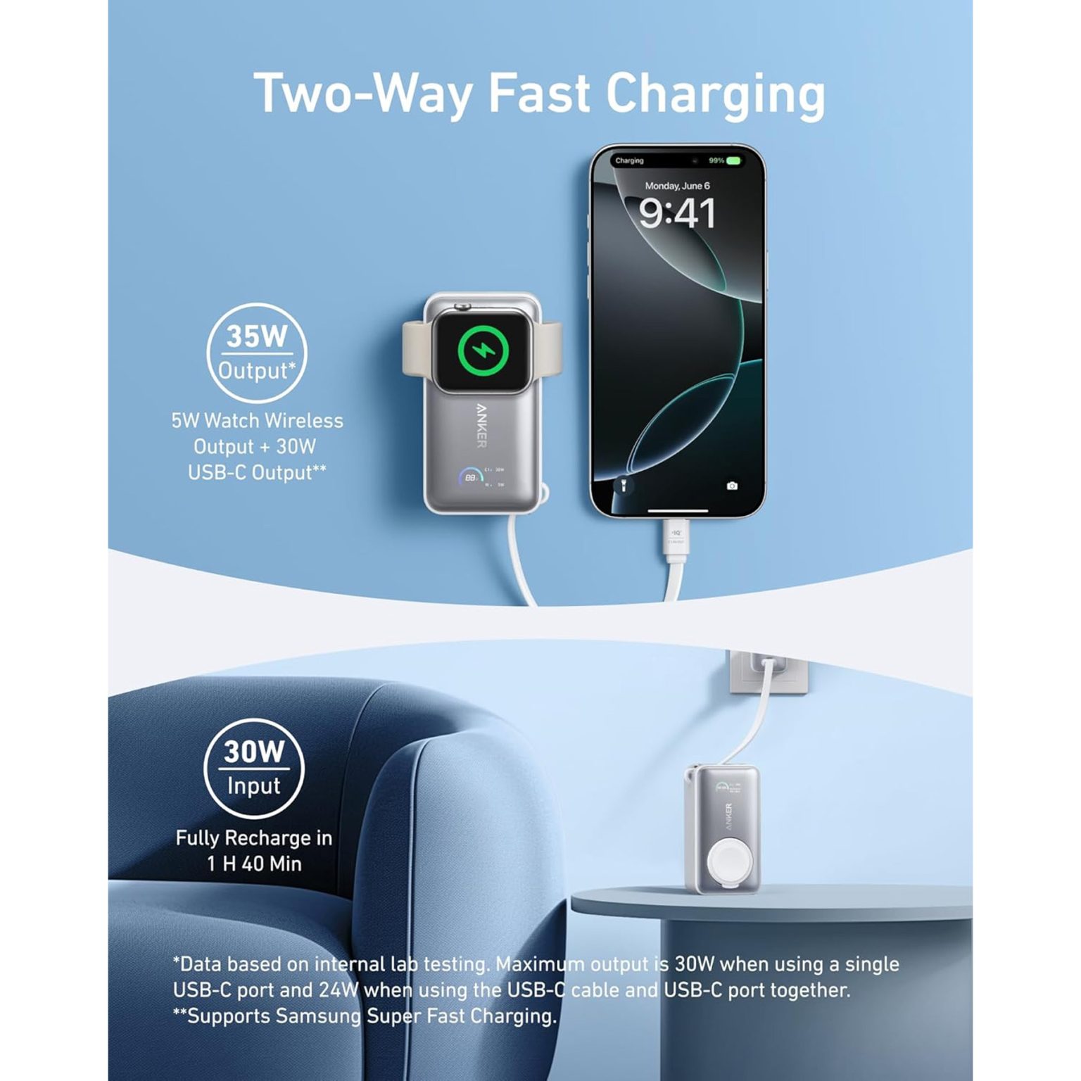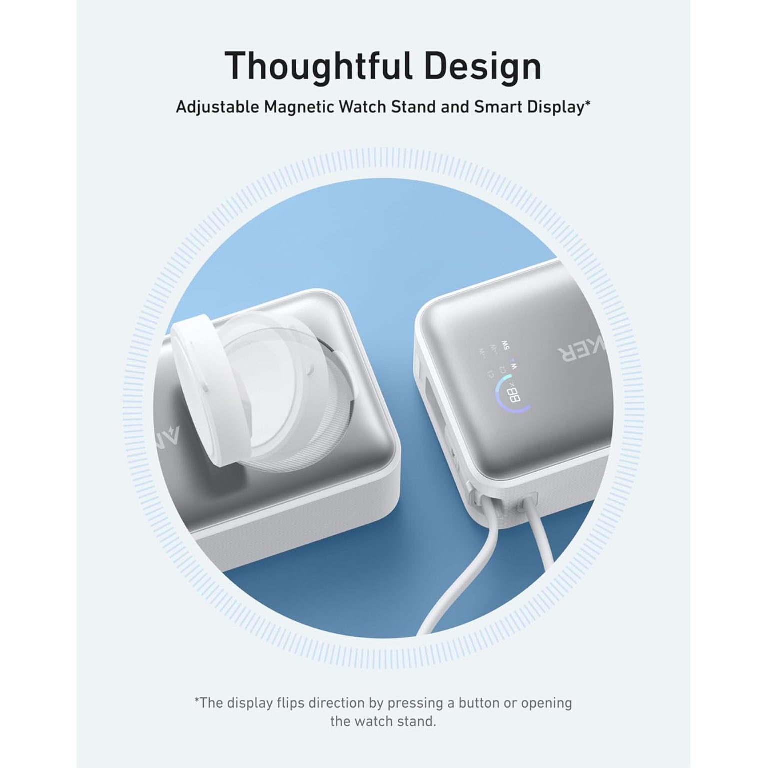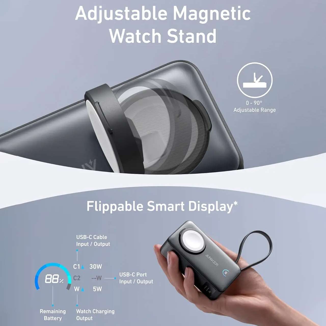 پایه آهنربایی Anker MagGo با زاویه 0 تا 90 درجه قابلتنظیمه و اپلواچ رو توی حالت Nightstand نگهمیداره. طراحی سبک و جمعوجور این پاوربانک با ابعاد فقط 95×51×32.4 میلیمتر و وزن 245 گرم، اون رو به گزینهای ایدهآل برای میز کار، سفر یا استفاده روزمره تبدیل کرده.