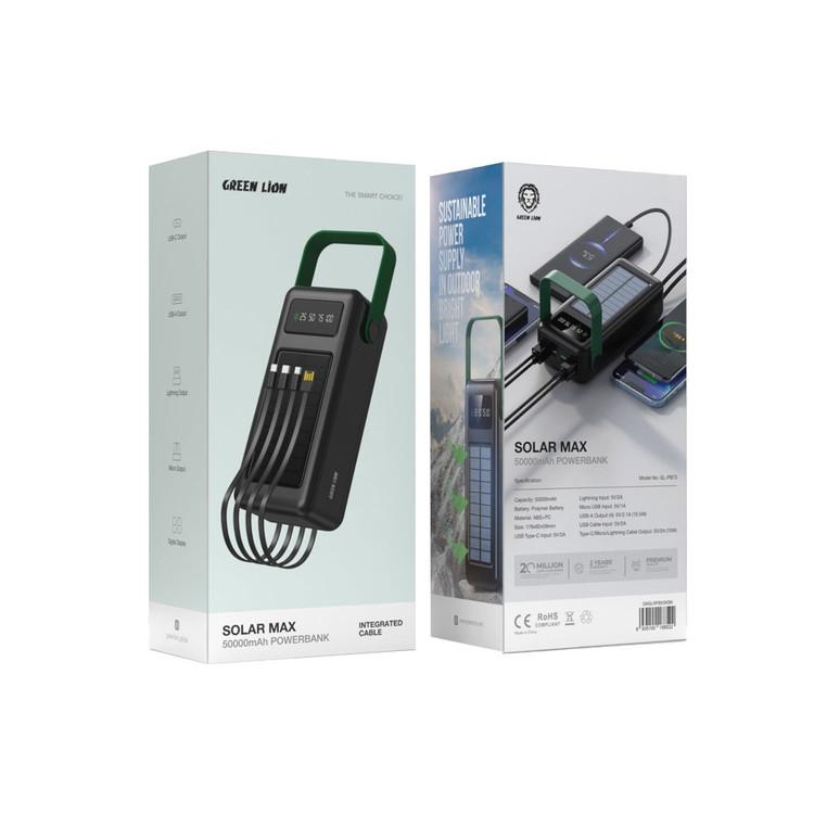 Green Lion Solar Max 50000mAh ترکیبی از ظرفیت بالا، پنل خورشیدی و طراحی هوشمند است که آن را به همراهی مطمئن در سفرها و شرایط بیرونی تبدیل میکند!