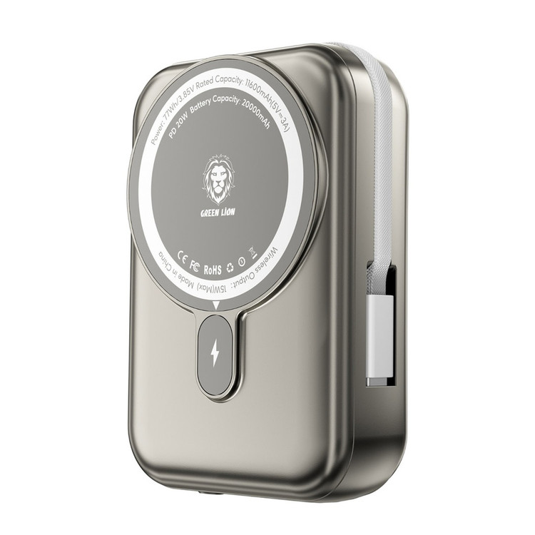 شارژ همزمان 3 دستگاه با پاوربانک گرین لاین یک تجربه جدید است. با توجه به فناوری Magsafe و بی سیم و همچنین کابل لایتنینگ یکپارچه و جاذبه مغناطیسی در این پاوربانک می توانید شارژ را کارآمدتر کنید. با وجود ظرفیت 20000 میلی آمپر ساعت این پاوربانک، این دستگاه باریک و سبک است. با این ظرفیت می تواند آیفون 15 را تا 4 بار با این پاوربانک شارژ کند.
