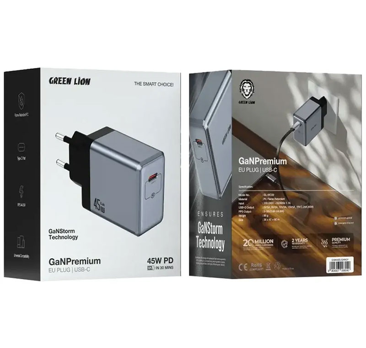 شارژر دیواری Green Lion GaN Premium EU Plug Wall PD 45W شارژ پرقدرت و پرسرعتی را در یک طراحی بسیار کوچک ارائه میدهد. این شارژر که از مواد PC ضد حریق ساخته شده است، برای شارژ ایمن و مقاوم دستگاههای شما طراحی شده است. شارژ سریع از طریق خروجی USB-C در محدوده ورودی 100 تا 240 ولت: 5 ولت/3 آمپر، 9 ولت/3 آمپر، 12 ولت/3 آمپر و 20 ولت/2.25 آمپر (45 وات) برای دستگاههای مختلف ارائه میشود. خروجی PPS (5-16 ولت/2.8 آمپر، حداکثر 44.8 وات) برای ارائه حداکثر توان به چندین دستگاه طراحی شده است. این شارژر با بهرهگیری از فناوری GaN Storm، از نظر مصرف انرژی کارآمدتر است و گرمای کمتری را هدر میدهد. از این رو، شارژ سریع و خنکسازی میتوانند همزمان انجام شوند. این شارژر اساساً یک راهحل شارژ قدرتمند و سریع برای تمام نیازهای برق شما است: از پشتیبانی از PD 45 وات گرفته تا قرارگیری در یک PC براق و ضد حریق.