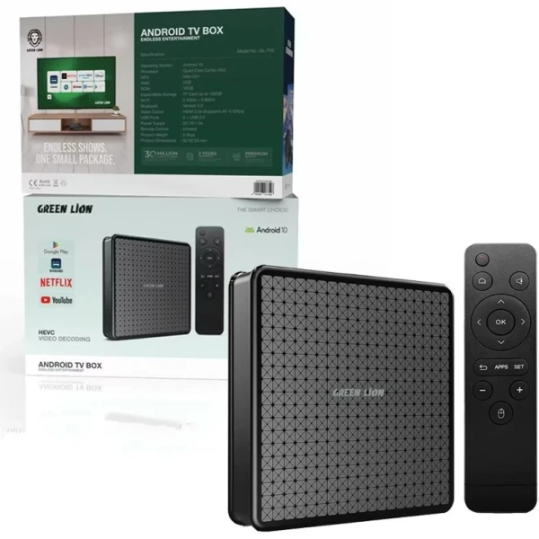 این اندروید باکس از شرکت Green Lion است که هدفش ارتقای تجربه سرگرمی خانگی با کیفیت ۴K است. سیستم عامل این دستگاه Android 10 دارد که امکان نصب اپلیکیشنهای مختلف (مانند استریم، بازی، مدیا پلیر) را میدهد. پردازنده آن Quad-Core Cortex-A53 است و پردازش گرافیکی را Mali-G31 برعهده دارد، که ترکیب مناسبی برای پخش ویدیو و استفاده سبکتر ایجاد میکند. حافظه این باکس ۲ گیگابایت رم و ۱۶ گیگابایت حافظه داخلی است. همچنین اسپیس ذخیرهسازی را میتوان با کارت TF تا ۱۲۸ گیگابایت گسترش داد. از نظر اتصال، دو باند وایفای (۲.۴ GHz و ۵.۸ GHz) دارد و بلوتوث نسخه ۵.۰ پشتیبانی میشود، که برای اتصالات بیسیم مثل کیبورد، هدفون یا اسپیکر مناسب است. خروجی تصویر: HDMI 2.0a با پشتیبانی از ۴K @ 60fps. در کنار پورت HDMI، خروجی AV هم دارد، بنابراین میتوان آن را به تلویزیونهای قدیمیتر نیز متصل کرد. دو پورت USB 2.0 برای اتصال فلش، هارد اکسترنال یا لوازم جانبی دیگر تعبیه شده است. پاور دستگاه: برق DC با ورودی 5V / 2A. کنترل از راه دور: از نوع Infrared (IR)، یعنی باید خط دید بین کنترل و باکس برقرار باشد.همچنین قابلیت اتصال تلفن هوشمند بدون کابل را دارد.