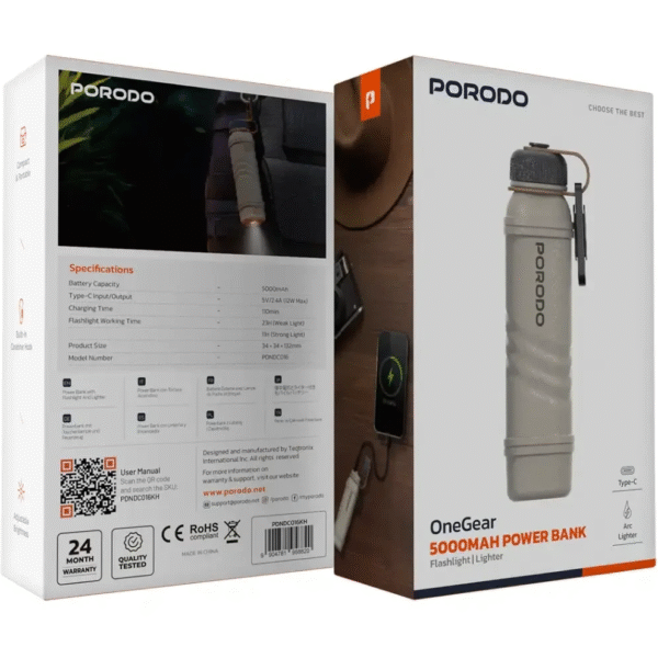 پاوربانک ۵۰۰۰ Porodo OneGear Flashlight & Lighter PDNDC016KH یک محصول همهکاره است که شارژ دستگاه، روشنایی و فندک را با هم ترکیب میکند.