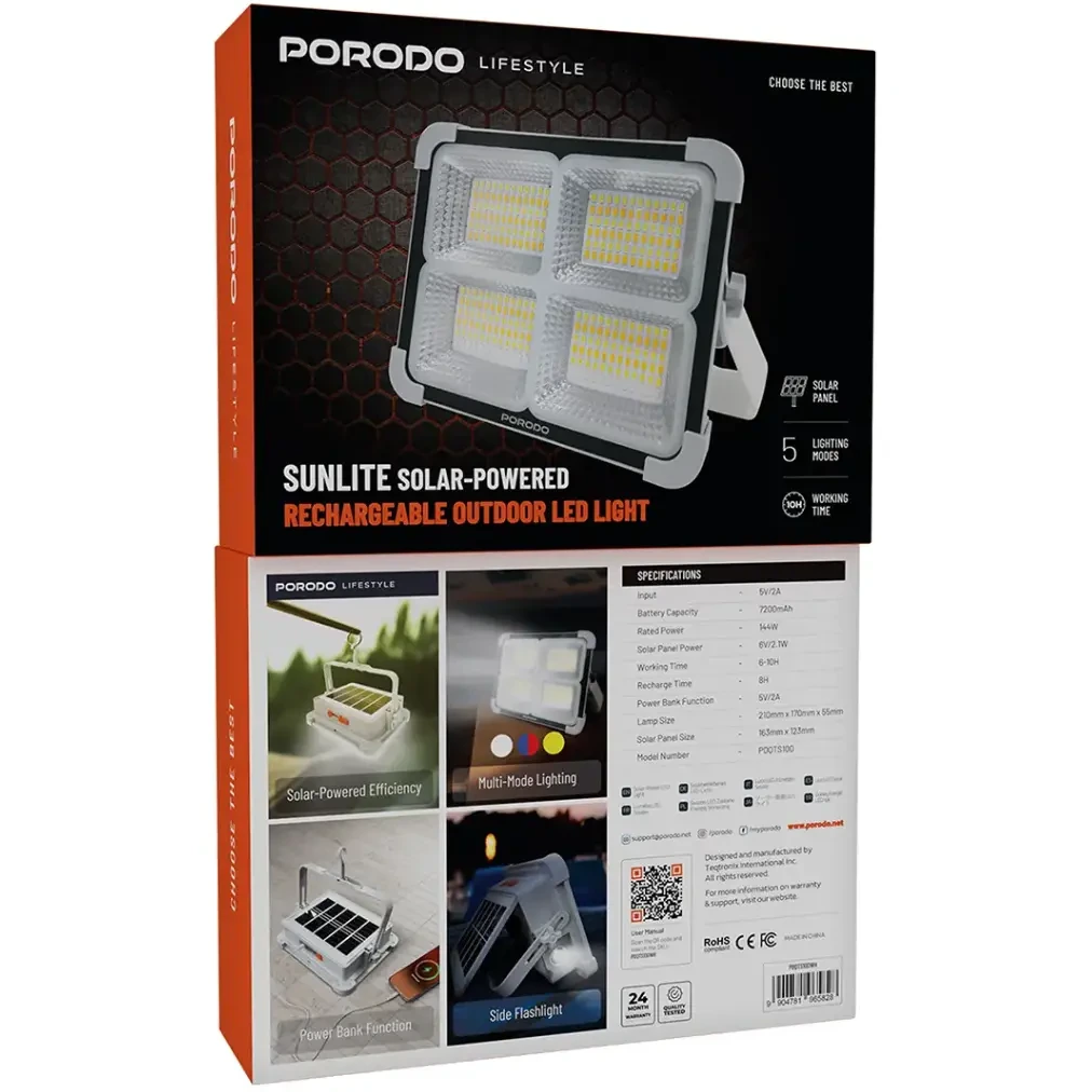 چراغ خورشیدی قابل شارژ Porodo Sunlite مدل PDQTS100WH